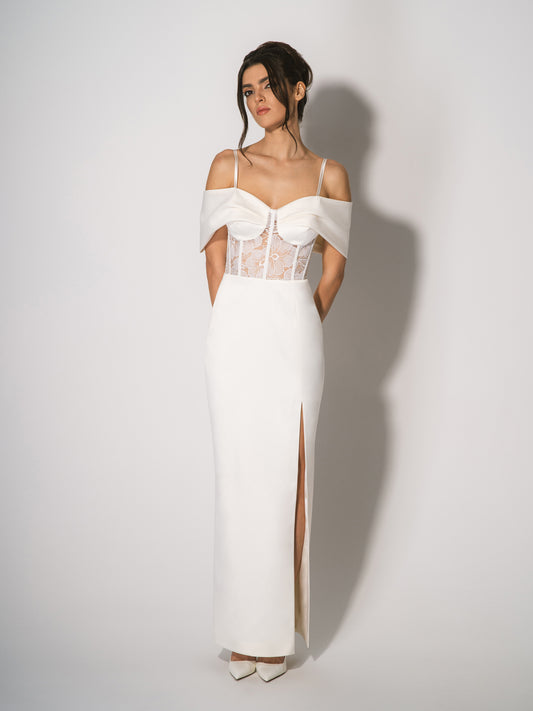 Belle of the Ball Satin Maxi Dress with Lace Corset - Pearl White