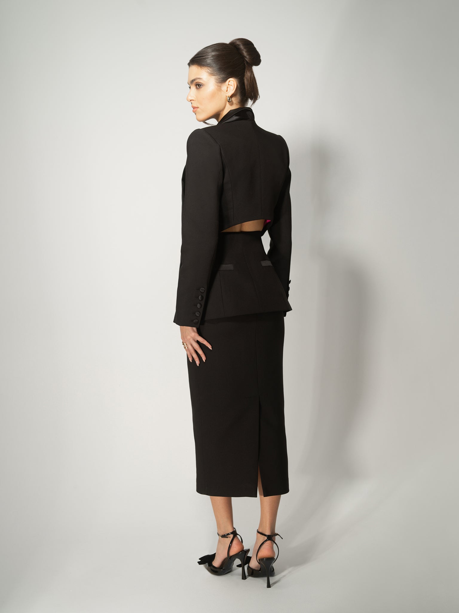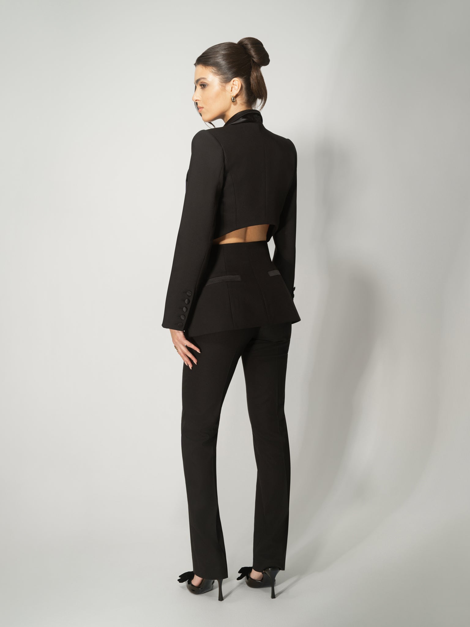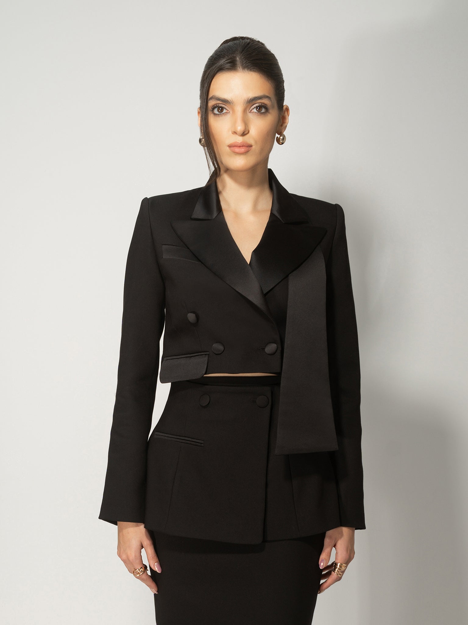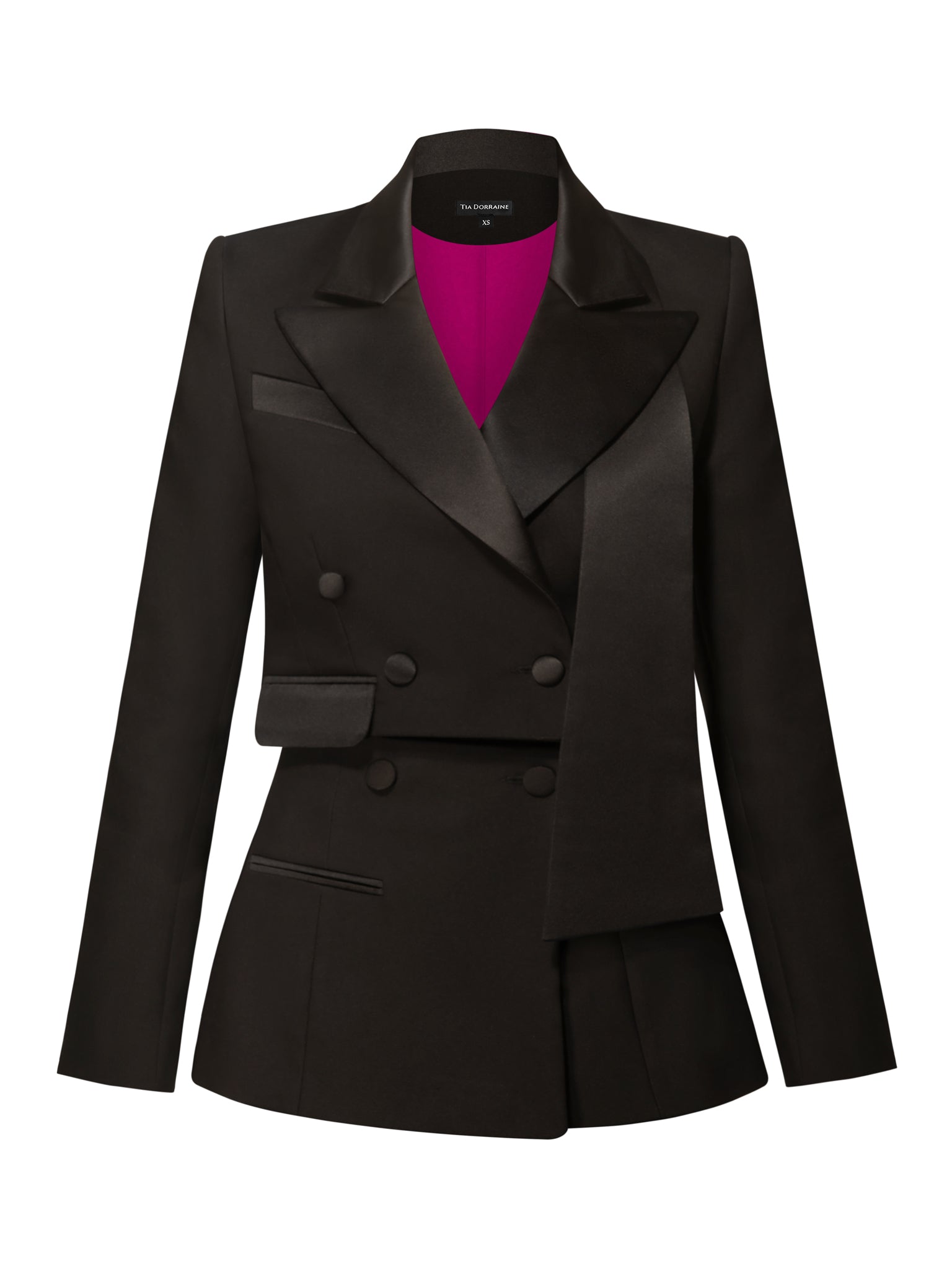Tia Dorraine reimagines the classic tuxedo blazer with a chic twist in this two-part design.