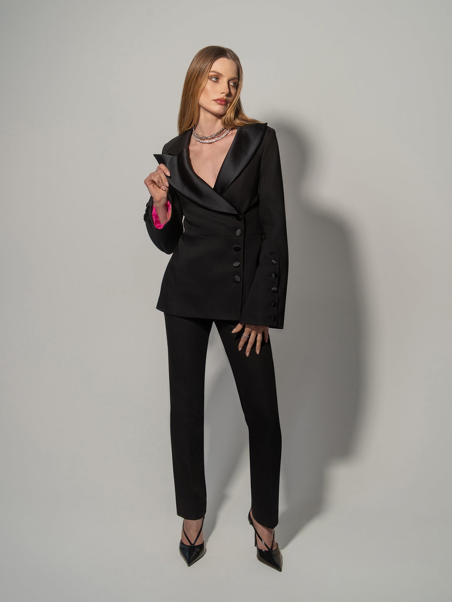 Veer away from traditional gowns and opt instead for this black tuxedo blazer and its matching Femme Fatale Tailored Trousers and Midnight Sky Asymmetric Belt for your next formal event.