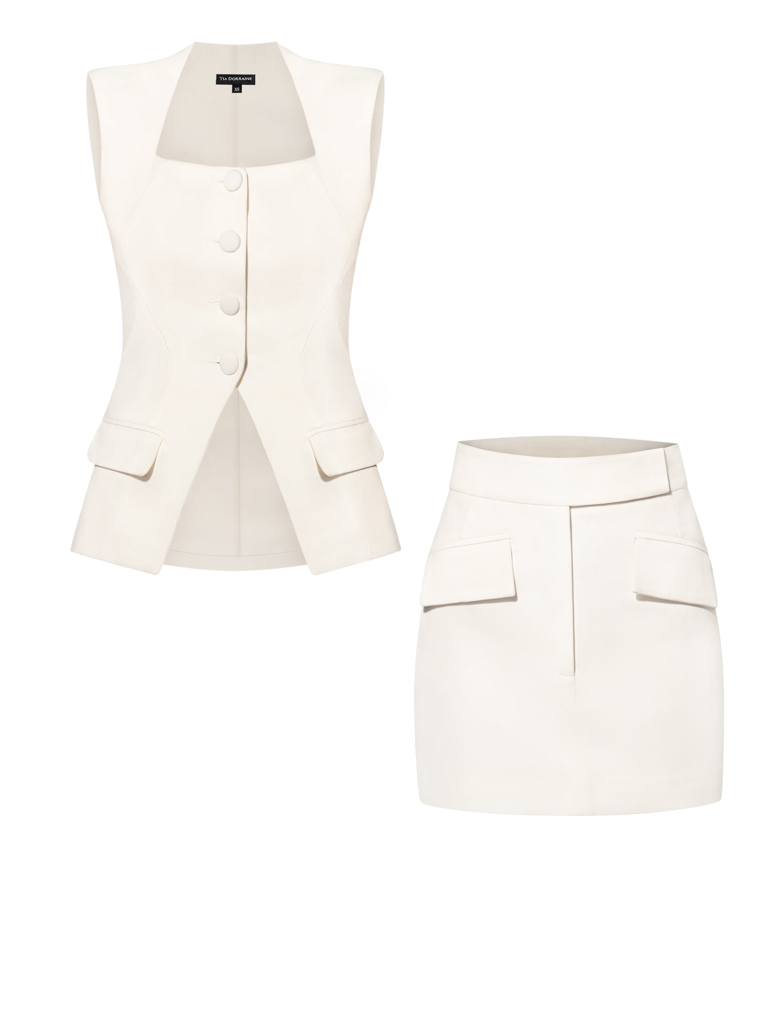 Crafted from luxurious stretch crêpe fabric and fully lined with silky satin for comfortable fit, the vest features a square neckline, internal boning and jetted pockets with flaps.