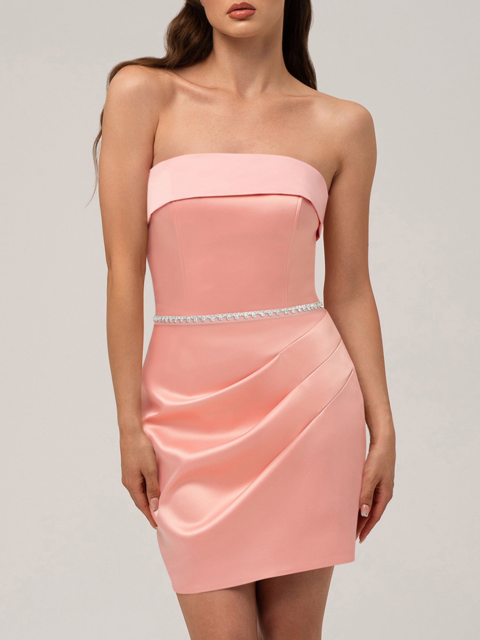 The alluring design has a strapless bodice enhanced by internal boning and features structured draped sleeves that are easily removed for a more streamlined look. The draped skirt adds a sense of irresistible glamour, while the fold-over neckline conveys a contemporary feminine feel.