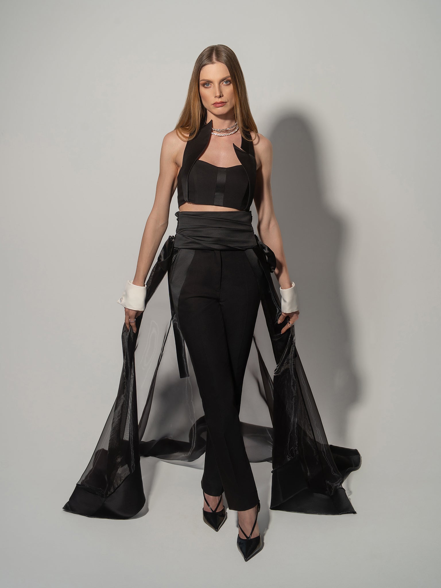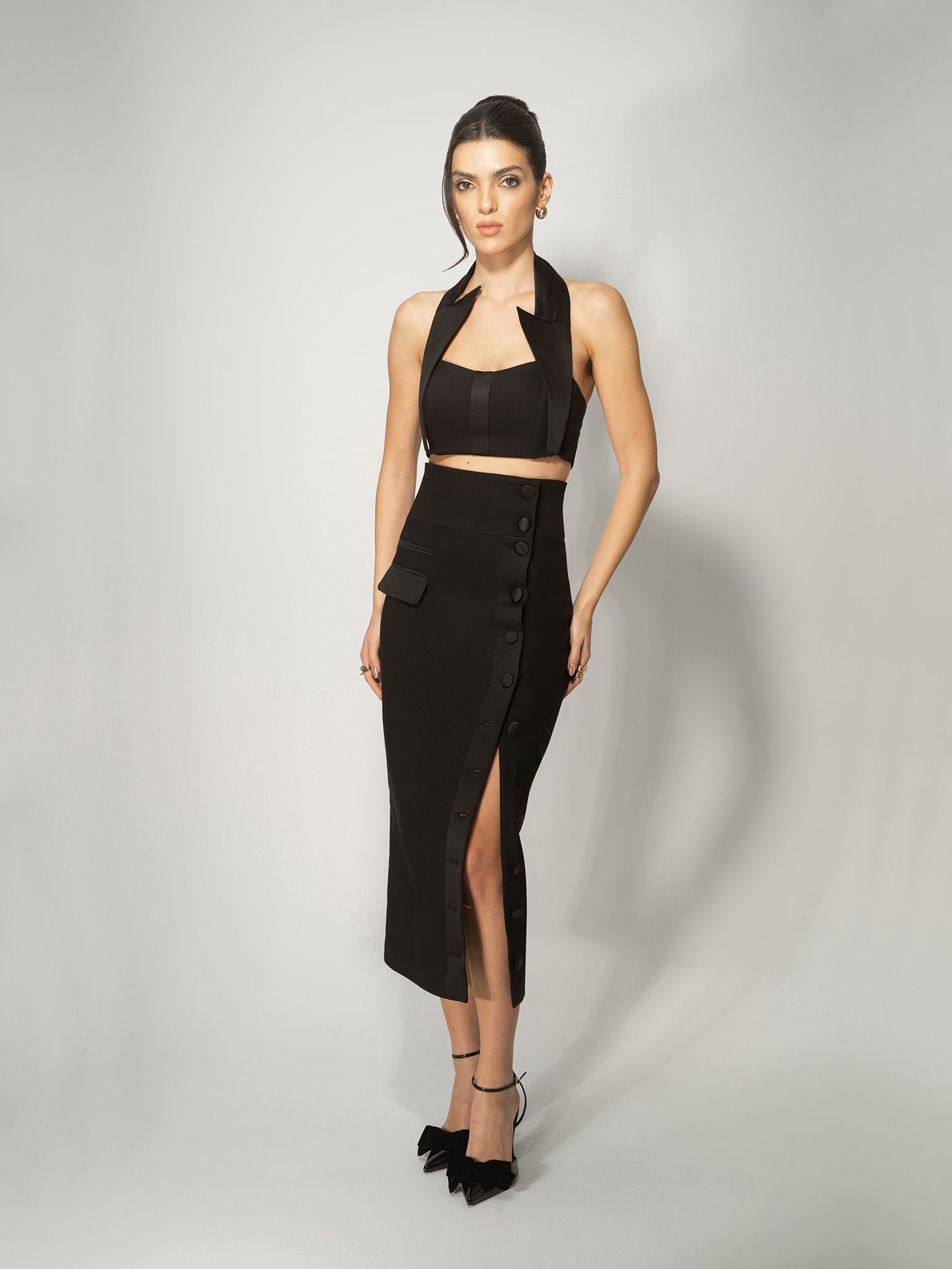 This cropped bustier top is a real powerhouse piece. The stretch cotton blend fabric ensures comfort, while the sharp tailoring adds a modern edge.
