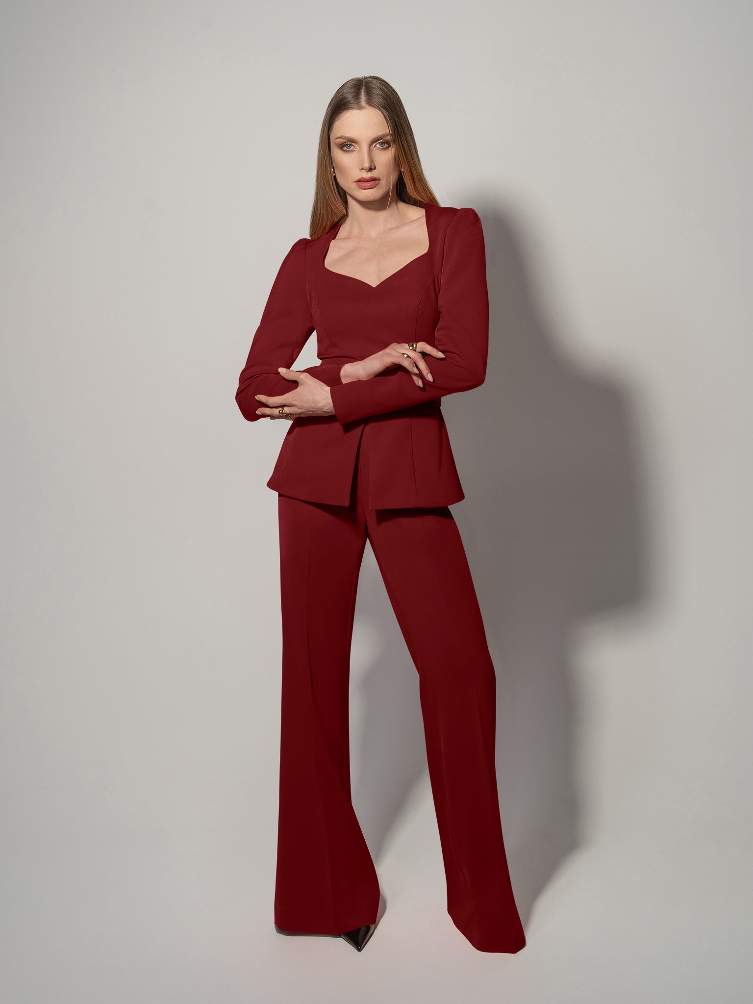 Fitted Blouse & Trousers Set - Burgundy