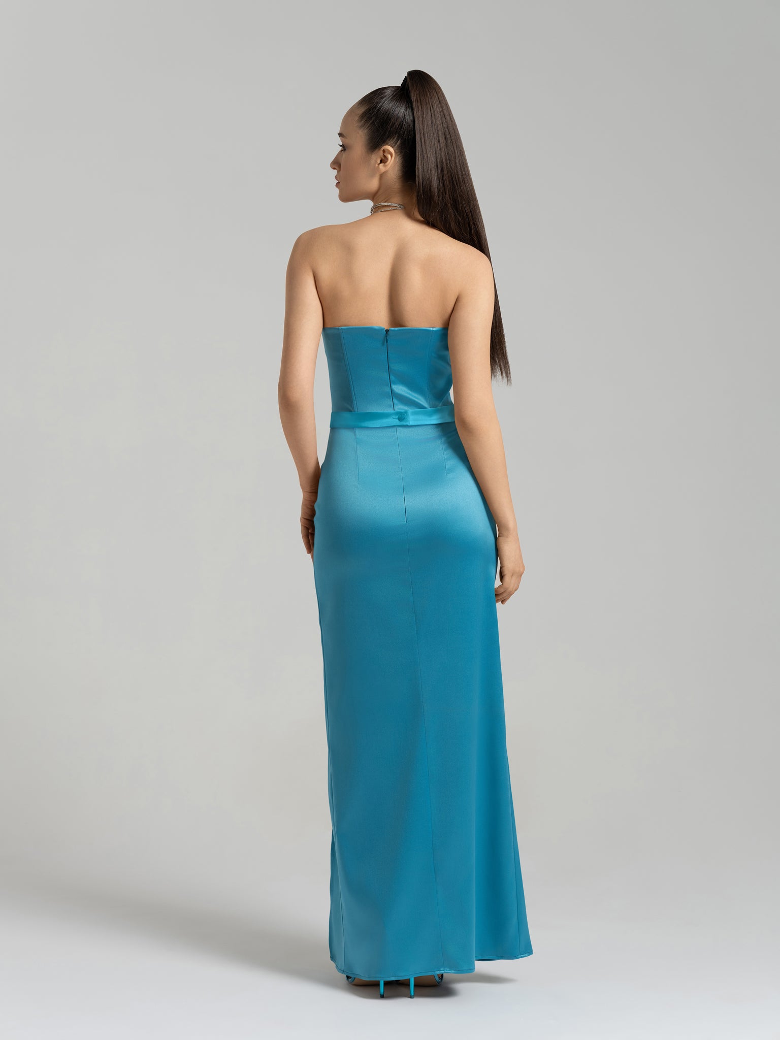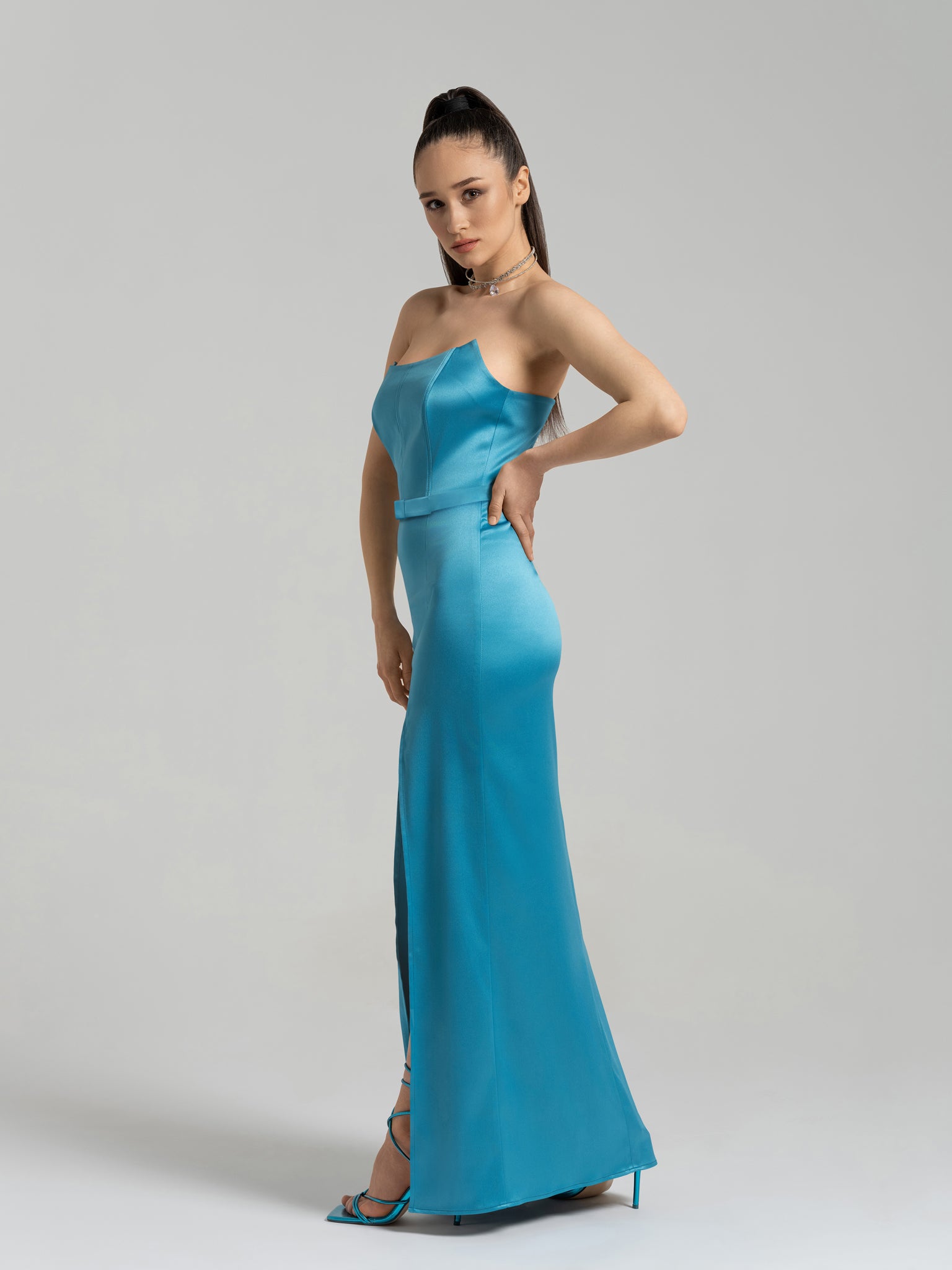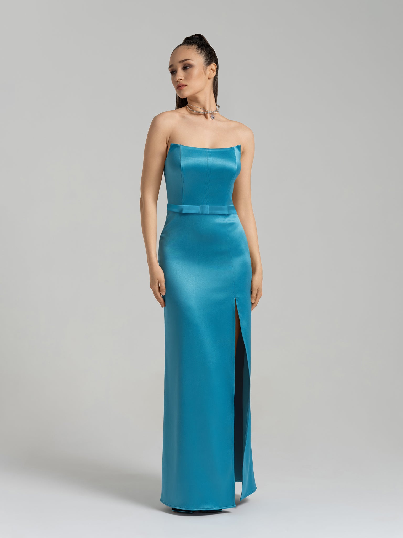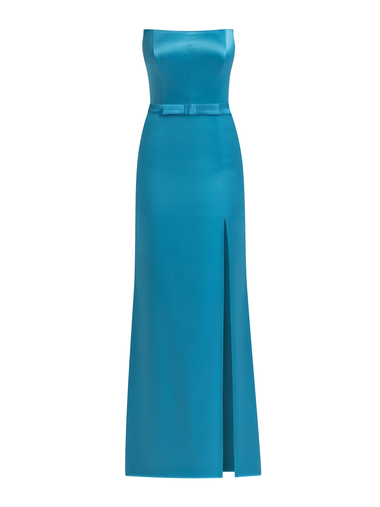 Make an unforgettable entrance at your next event with this satin maxi dress. Cut to flatter, the silhouette has a scooped strapless neckline, corset-style bodice with internal boning, and a curve-hugging column skirt with a thigh-high side slit.