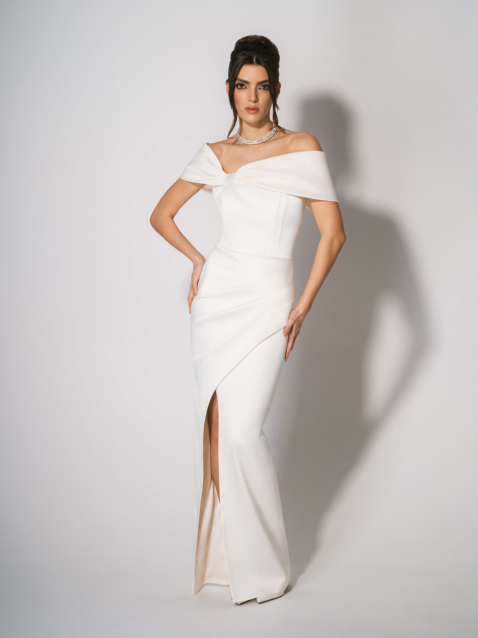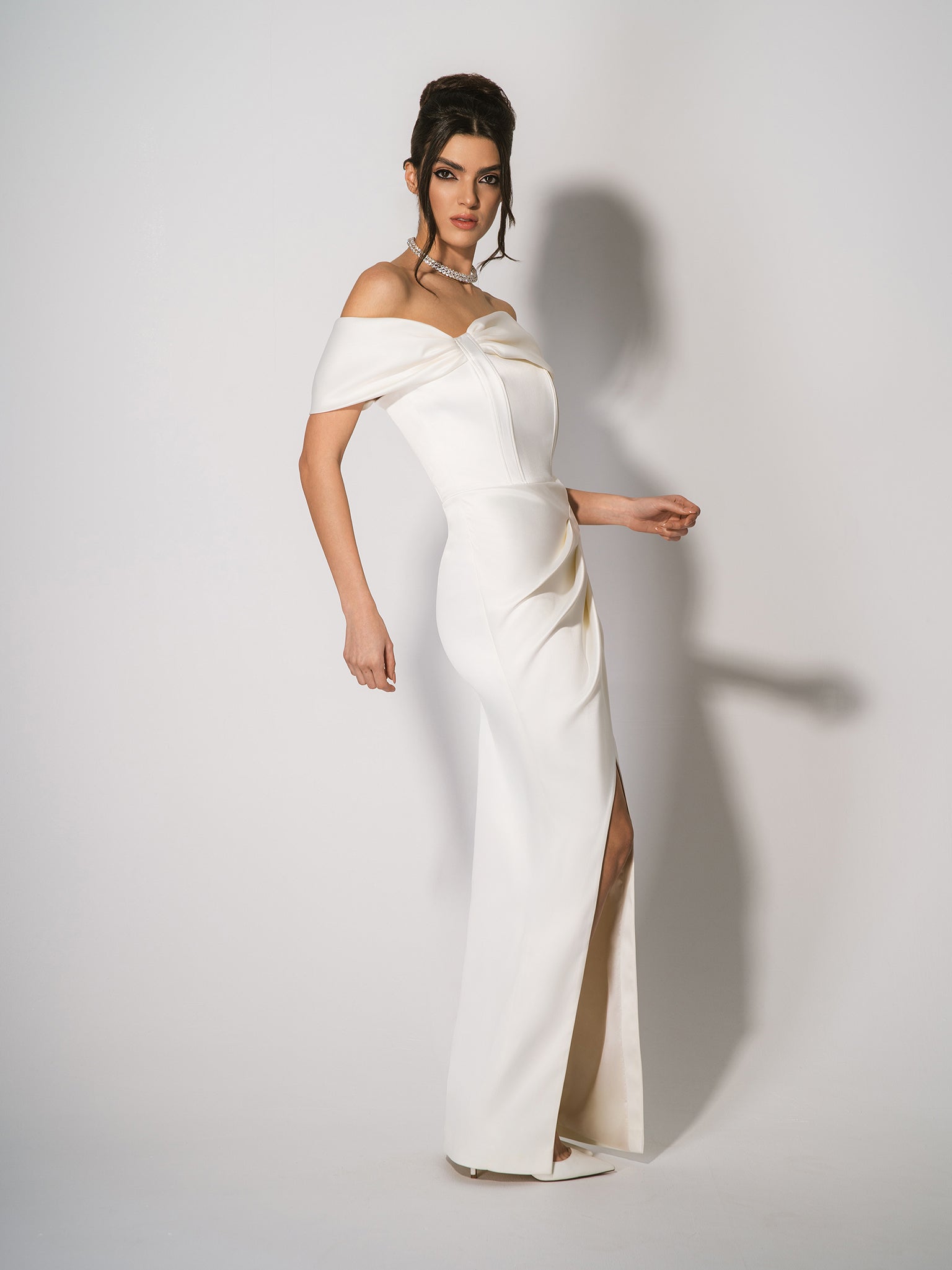 Designed for a form-fitting silhouette, this pearl white maxi dress reflects Tia Dorraine’s innovative approach to fashion, as well as its elegant and romantic aesthetic. The draped skirt adds a sense of irresistible elegance, while the fabulous ribbon conveys a contemporary feminine feel.