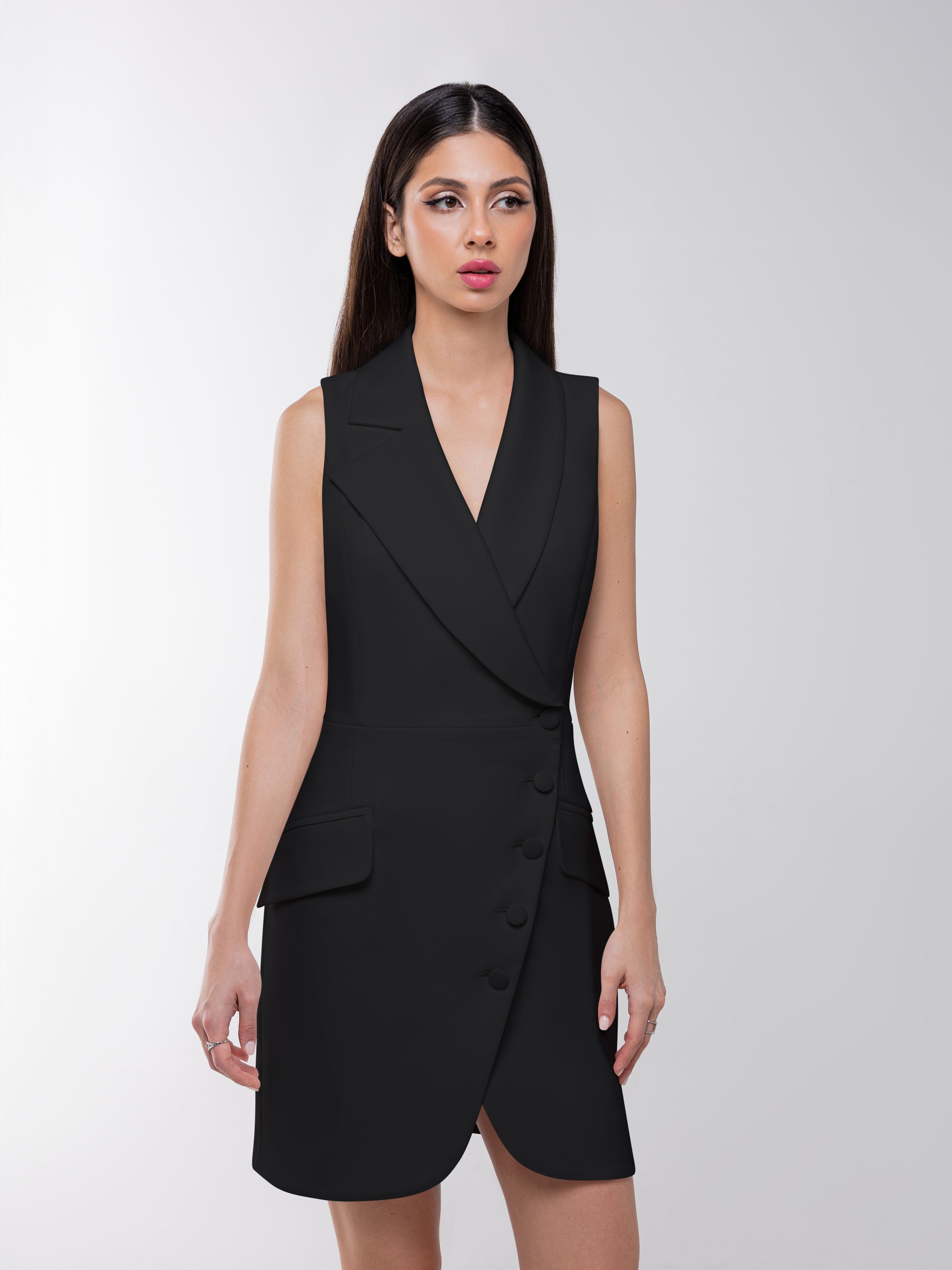 This blazer mini dress offers a chic take on power dressing with its structured cut that delivers timeless elegance, while its asymmetric lapels and double-breasted button closure add a contemporary touch.