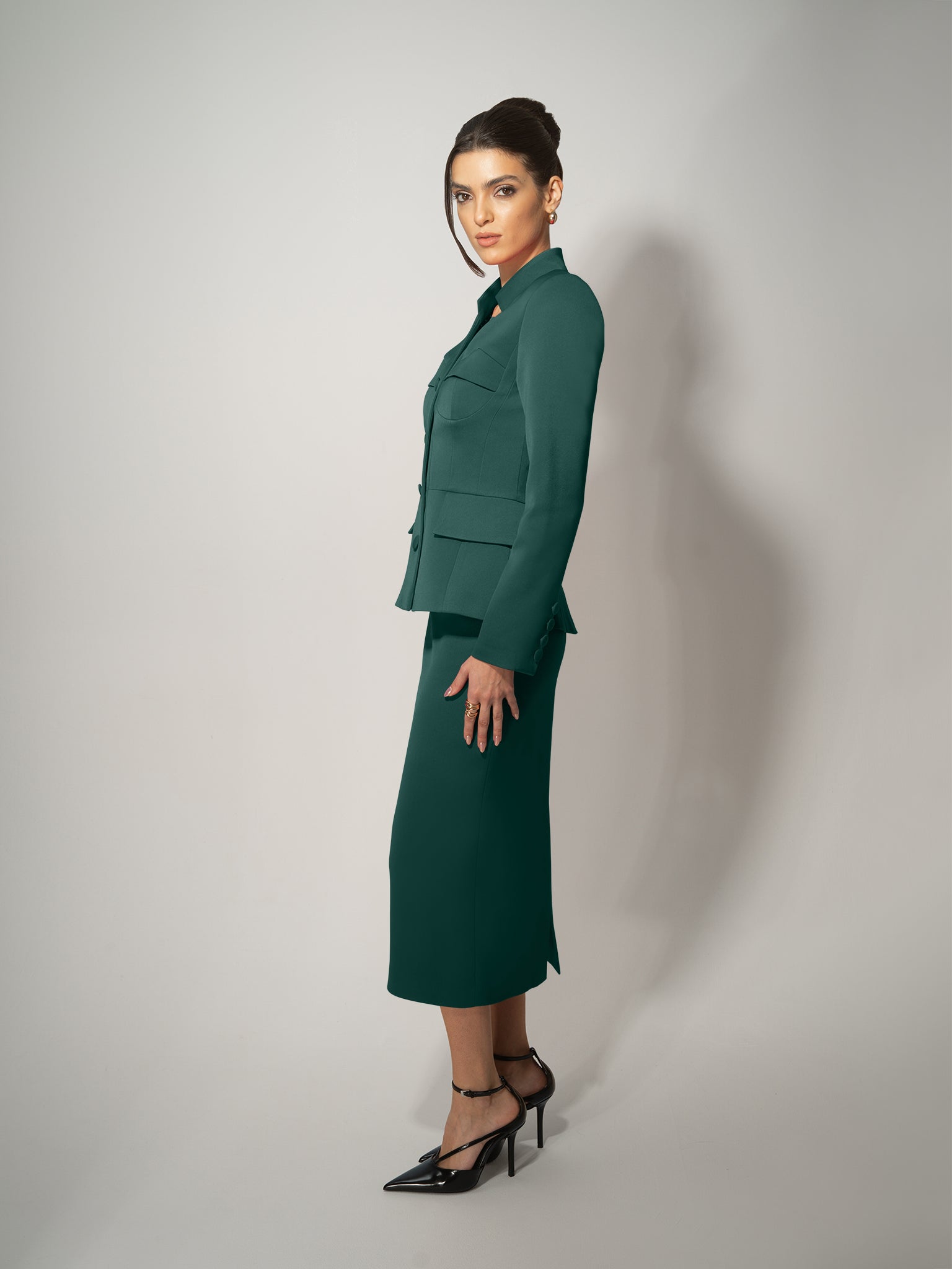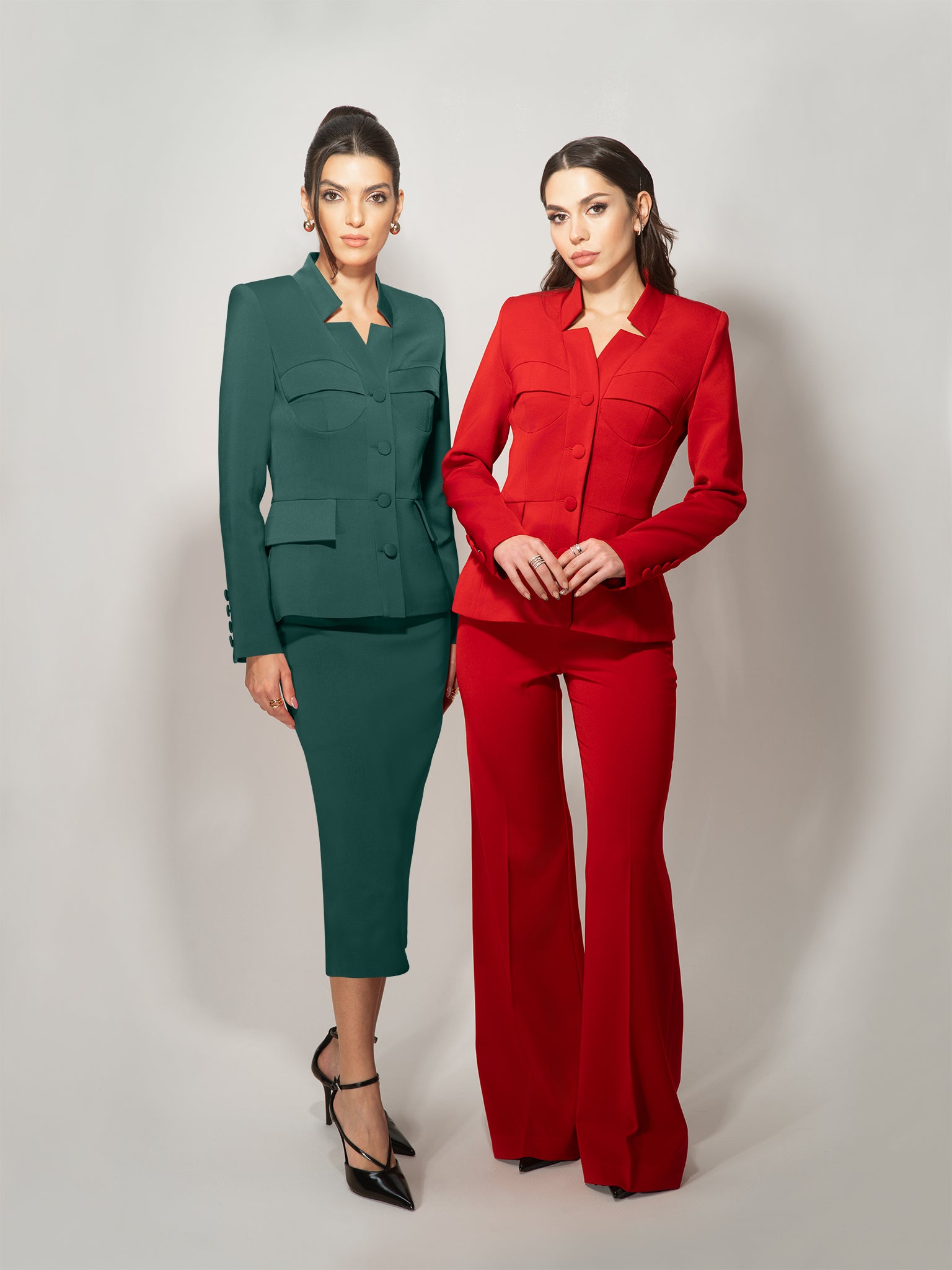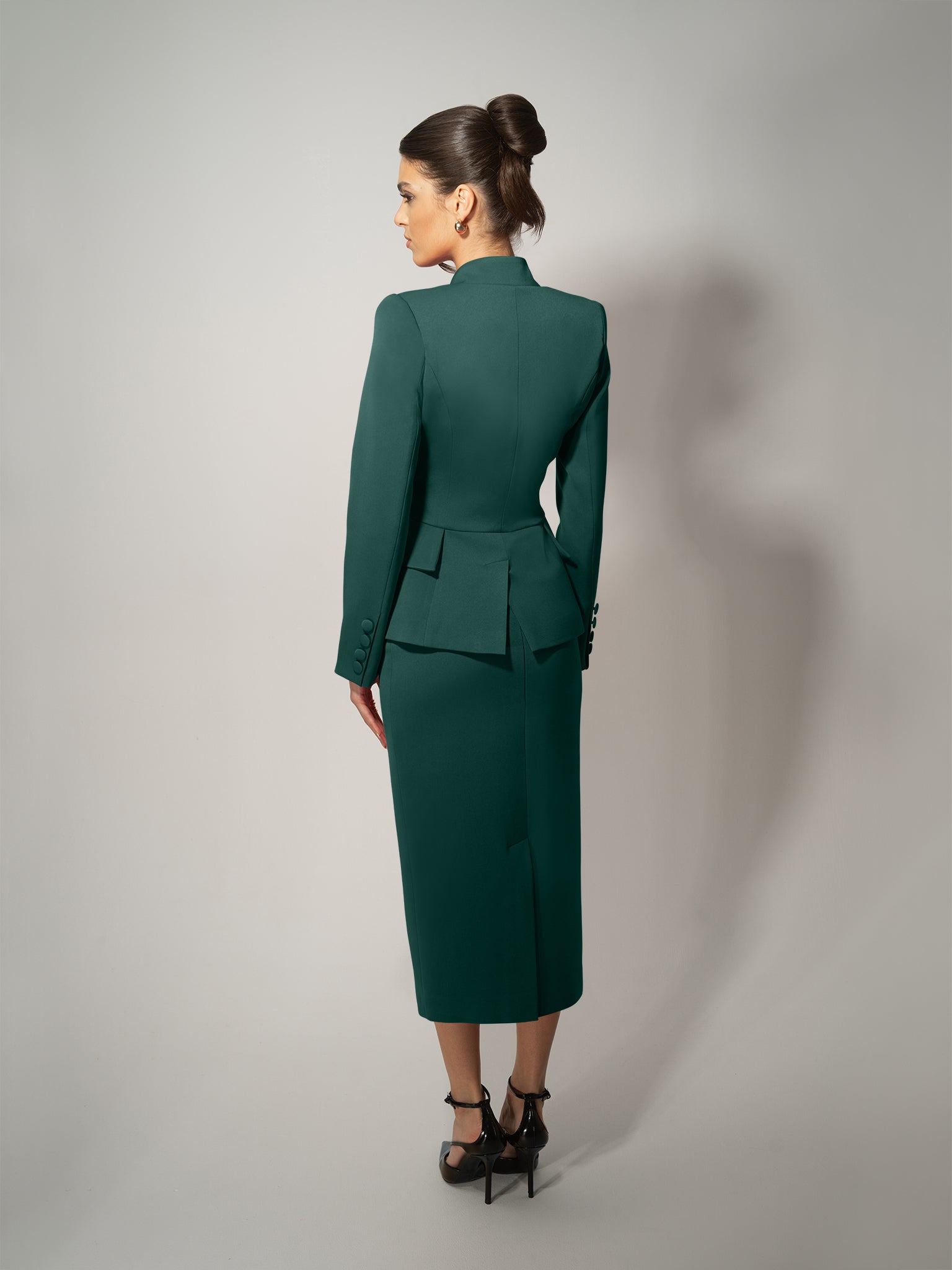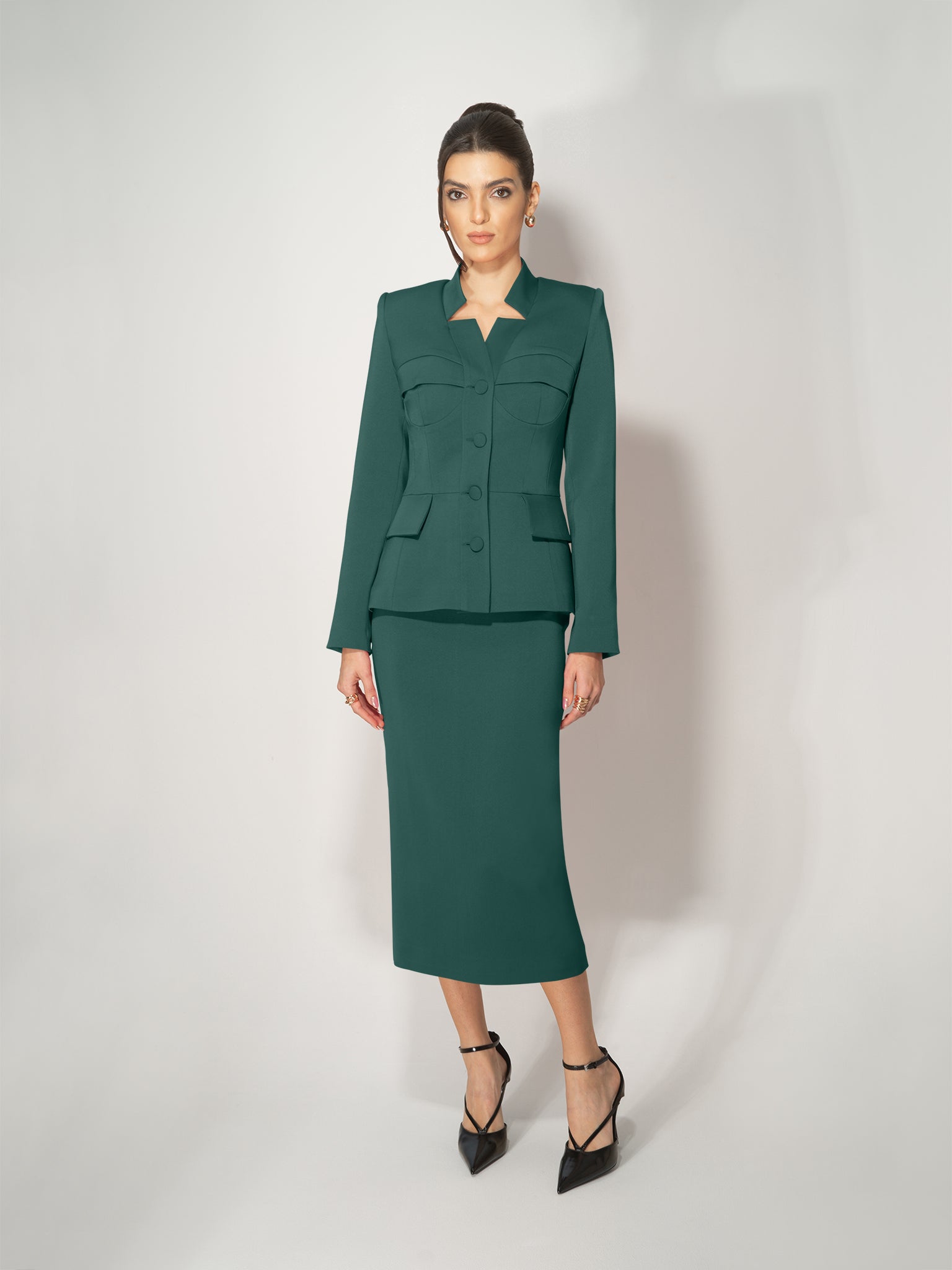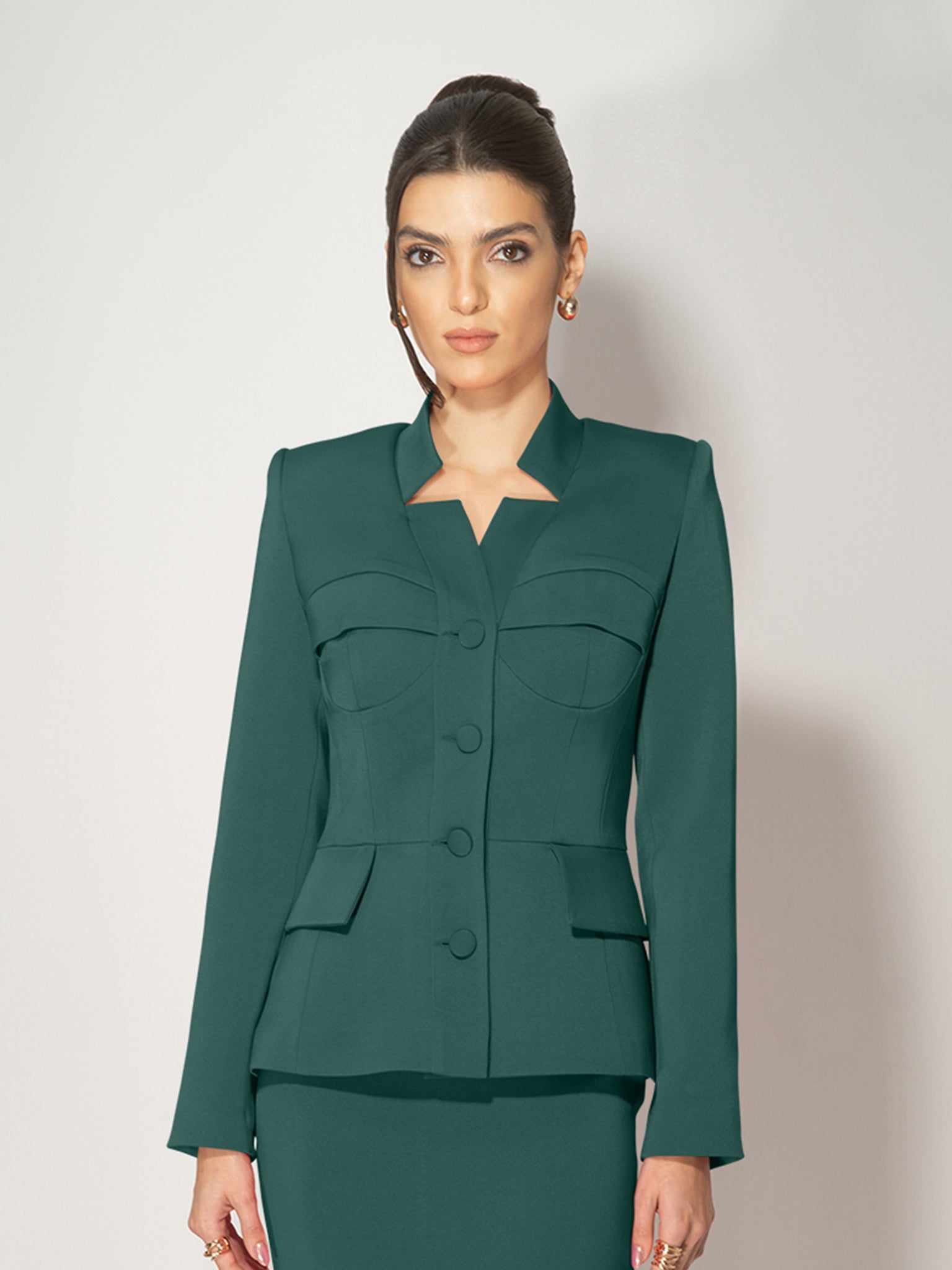 - Single-breasted with sharp shoulders