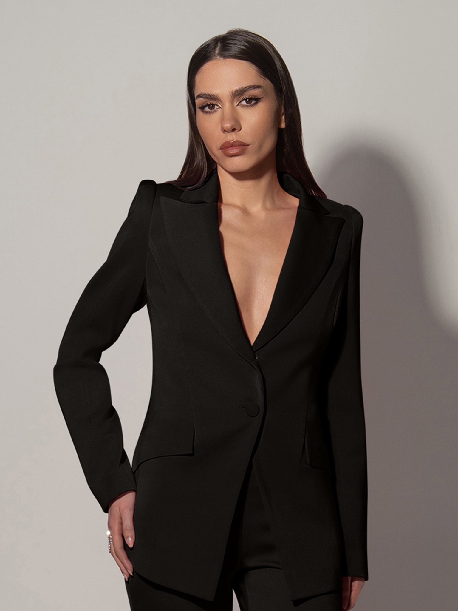 Made from a luxurious stretch crêpe fabric, the form-fitting single-breasted style has sharp shoulders, seamlessly integrated flap pockets and a same-fabric button for a contemporary touch.